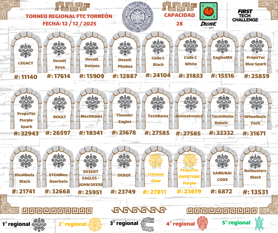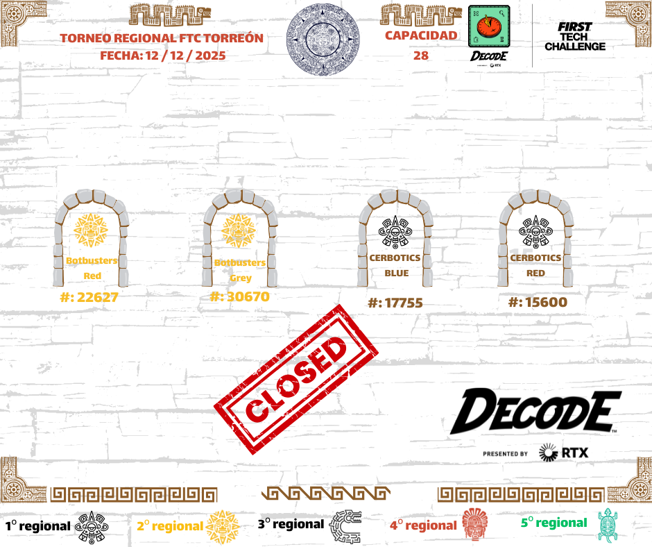 Nos complace darles la bienvenida al Regional FTC TORREÓN, un evento en el que los equipos tendrán la oportunidad de demostrar sus habilidades en diseño, programación, estrategia y trabajo en equipo, mientras forman parte de la comunidad de FIRST Tech Challenge en México.